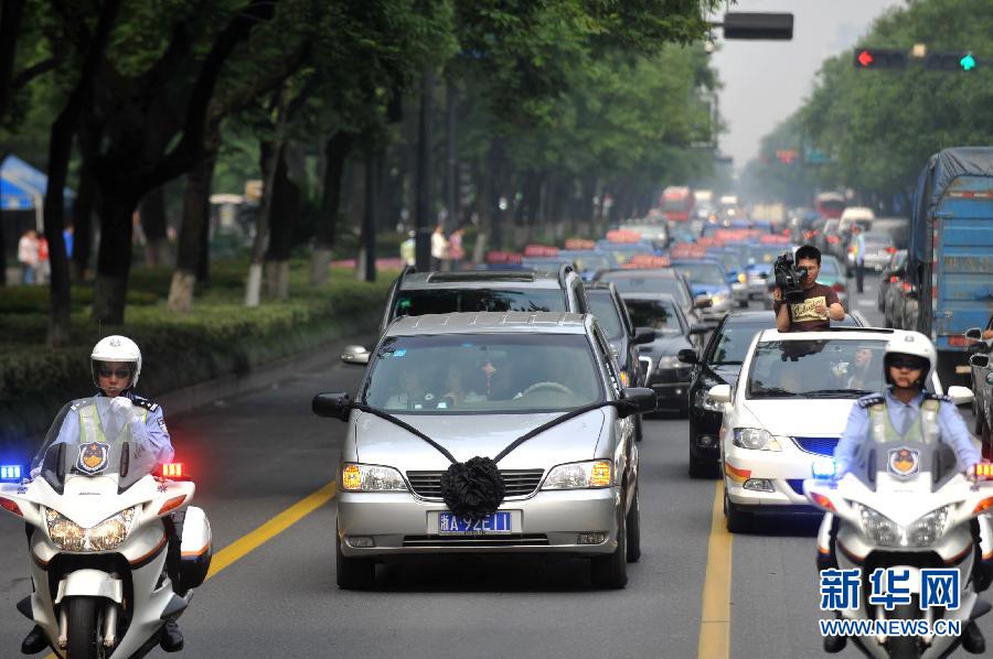 6月4日,杭州交警開道,載有吳斌遺體的靈車在杭州市區(qū)行駛,數(shù)十輛出租車自發(fā)加入送行的車隊(duì)。