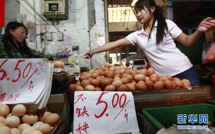 6月5日,上海農(nóng)產(chǎn)品中心批發(fā)市場(chǎng)一個(gè)攤位的每斤雞蛋零售價(jià)已經(jīng)達(dá)到5元,比6月3日又上漲了0.2元。近日,全國(guó)多個(gè)城市雞蛋價(jià)格出現(xiàn)快速上漲。記者在上海農(nóng)產(chǎn)品中心批發(fā)市場(chǎng)了解到,短短兩個(gè)星期,該市場(chǎng)每斤雞蛋的批發(fā)價(jià)飆升了1.2元,并且尚未出現(xiàn)止穩(wěn)的勢(shì)頭。這讓許多市民都感到“不可思議”,甚至有網(wǎng)友戲稱雞蛋成了“火箭蛋”。業(yè)內(nèi)人士認(rèn)為,虧損所導(dǎo)致的蛋雞存欄數(shù)量減少、夏季高溫來(lái)臨蛋雞產(chǎn)蛋能力下降、端午節(jié)來(lái)臨需求集中釋放、養(yǎng)殖戶惜售等都成為近期蛋價(jià)飛漲的原因。新華社記者 裴鑫 攝