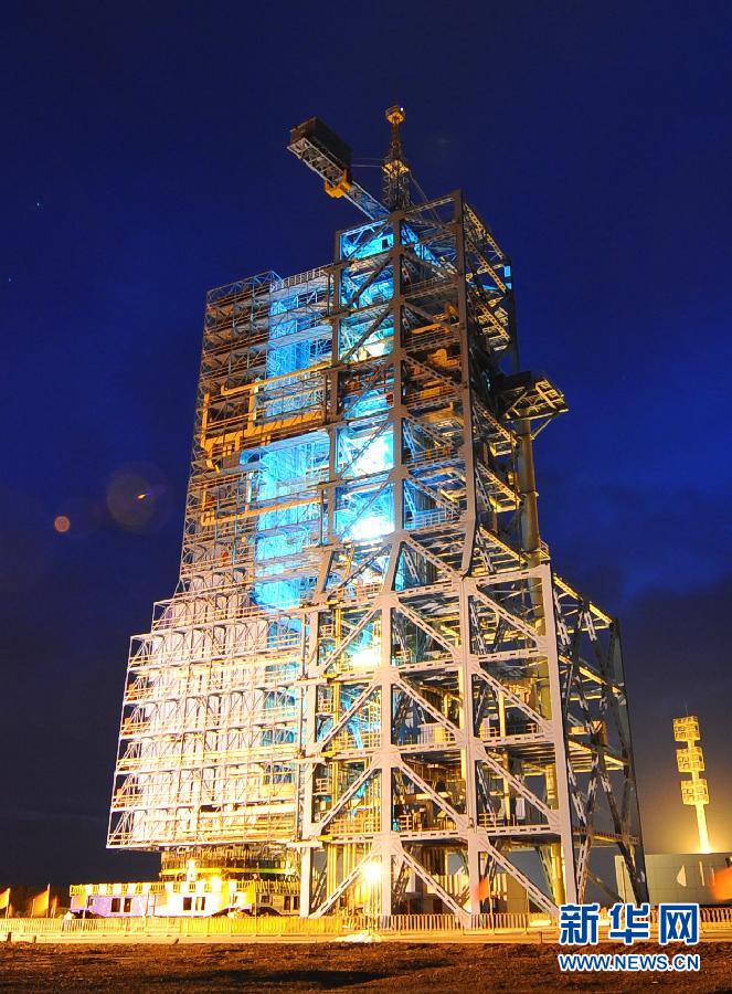 矗立在夜色中的神九發(fā)射塔架(6月13日攝)。西北大漠戈壁灘上的東風航天城,寧靜被打破,中國乃至世界的目光聚焦于酒泉衛(wèi)星發(fā)射中心一處湖藍色的發(fā)射塔架。塔架內(nèi)是神舟九號載人飛船和長征二F遙九火箭組合體,它們正等待3名中國航天員的“登機”,然后一起飛往太空,與天宮一號目標飛行器進行交會對接。這是繼去年11月無人乘坐的神舟八號飛船與天宮一號進行自動交會對接后,中國首次實施由航天員來完成的手動空間交會對接任務,將為2020年前后建造空間站奠定基礎。新華社記者李剛攝