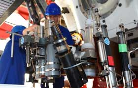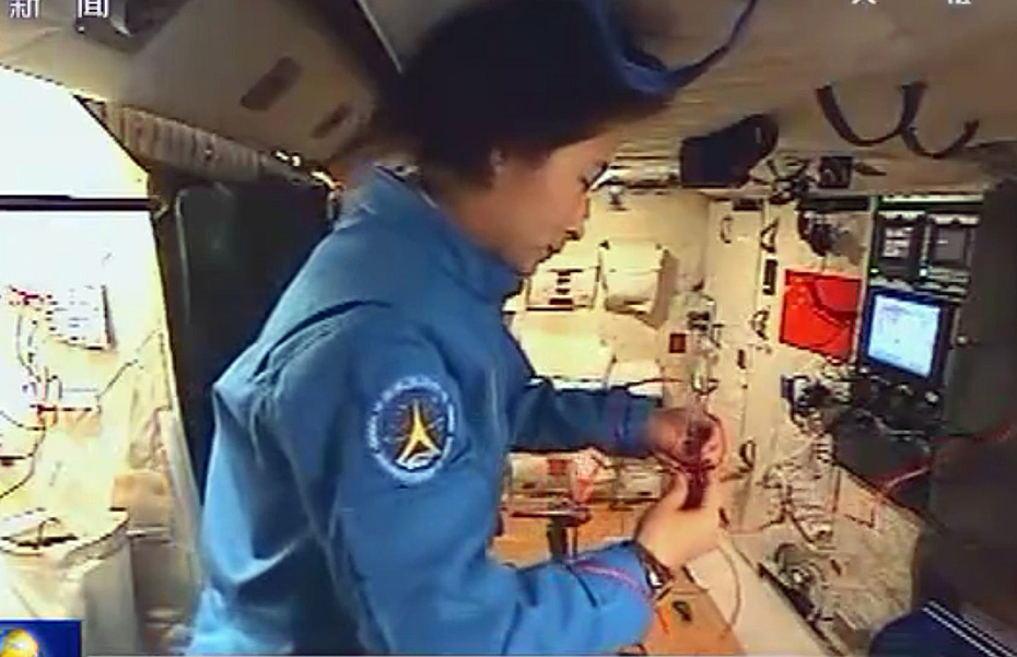 6月24日,神舟九號(hào)在完成首次手控交會(huì)對(duì)接之后,三名航天員重返天宮,繼續(xù)開展空間實(shí)驗(yàn)。圖為臨睡前,劉洋手里擺弄著絲繩,正在編織中國(guó)結(jié)。中新社發(fā)