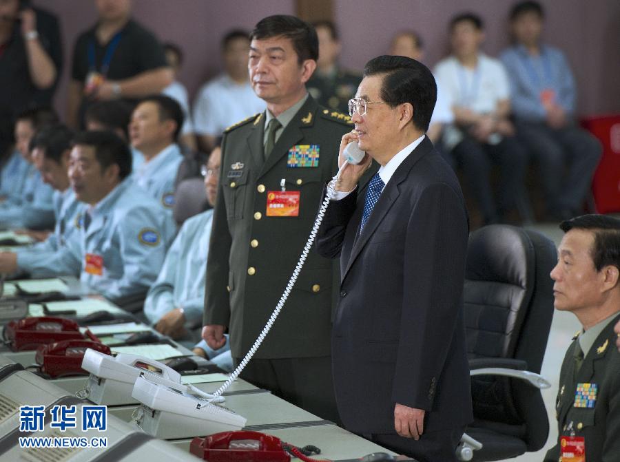 6月26日,中共中央總書(shū)記、國(guó)家主席、中央軍委主席胡錦濤在北京航天飛行控制中心,同神舟九號(hào)航天員景海鵬、劉旺、劉洋親切通話(huà)。新華社記者 馬占成 攝