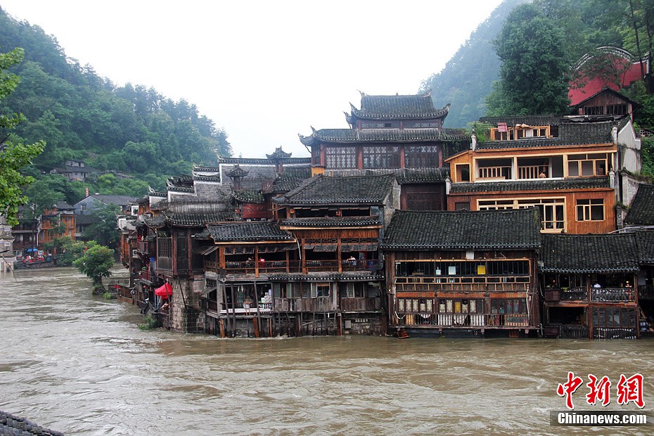 6月27日,湍急的河水圍住了鳳凰古城。25日晚開始,湘西鳳凰古城突降暴雨,一直持續(xù)了12個小時,沱江水面上的跳巖橋也被淹沒,橋上的不少木板被水流沖走,沱江泛舟景點已停止?fàn)I業(yè),船只全部轉(zhuǎn)移。目前,鳳凰古城相關(guān)部門已經(jīng)在部分淹水區(qū)域設(shè)置了警戒線,并有專人守在危險路段。