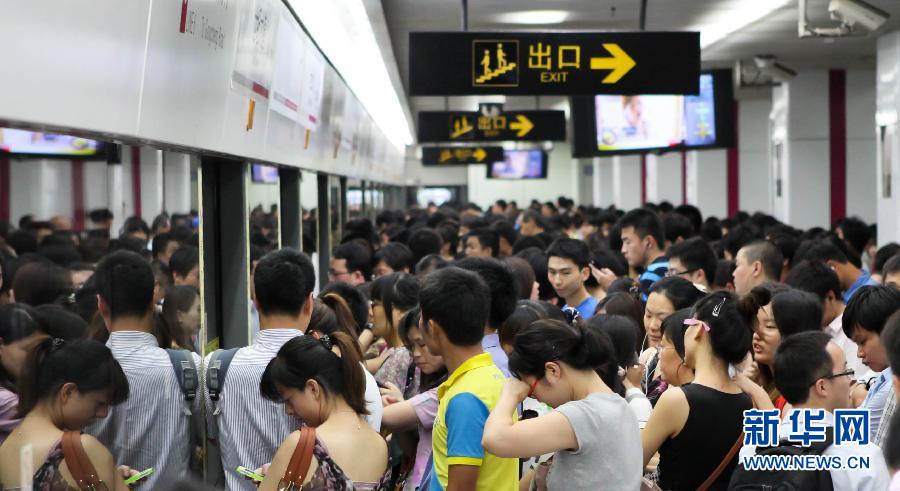 7月5日,上海地鐵世紀大道站6號線站臺人頭攢動。當日,上海最高氣溫逼近38攝氏度,在連日高溫下,上海地鐵經(jīng)歷著高溫、高客流、高強度的三高“烤”驗。上海地鐵人民廣場站、世紀大道站換乘大廳是最繁忙的兩個換乘站,分別承擔(dān)著三線換乘(1、2、8號線)和四線換乘(2、4、6、9號)的任務(wù)。在如今工作日日均客流逼近700萬人次的超大客流情況下,兩大換乘站承擔(dān)了上海地鐵的“超大換乘”任務(wù)! ⌒氯A社發(fā)(鈕一新 攝)