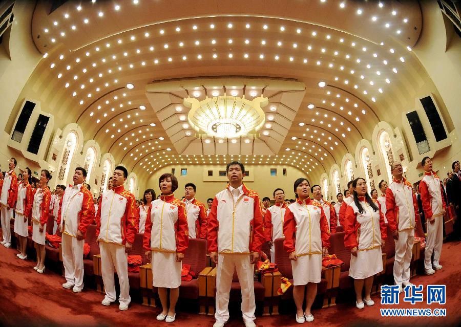 7月10日,代表團成員在成立大會上唱國歌。當(dāng)日,倫敦奧運會中國體育代表團在北京成立。中國體育代表團由621人組成,其中運動員396人,他們將參加23個大項、212個小項的比賽。新華社記者公磊攝