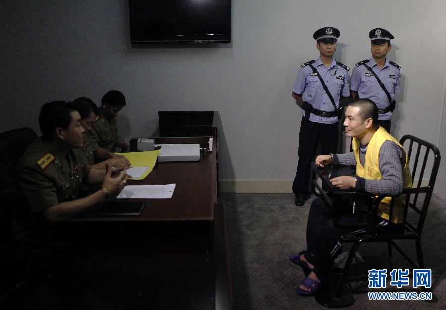 老撾公安部工作組提審“金三角”地區(qū)特大武裝販毒集團(tuán)及“10·5”案件主犯糯康(7月17日攝)。近日,應(yīng)中國(guó)公安部邀請(qǐng),由老撾公安部警察總局局長(zhǎng)西沙瓦擔(dān)任組長(zhǎng)的老撾公安部工作組,專程來(lái)華提審“金三角”地區(qū)特大武裝販毒集團(tuán)及“10·5”案件主犯糯康等犯罪嫌疑人。新華社記者王申攝