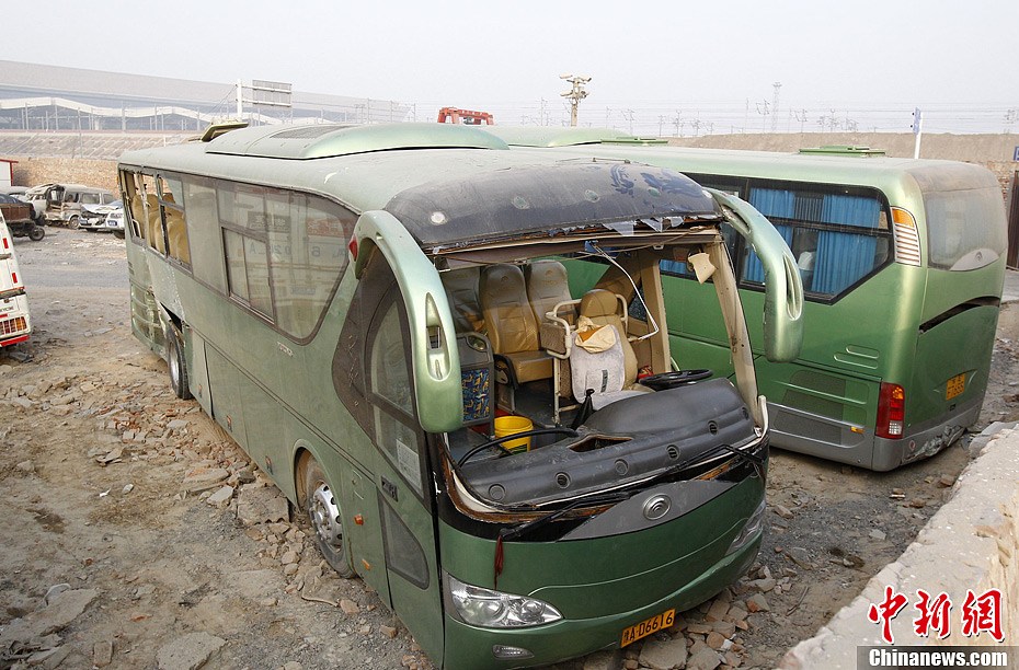 1月17日上午,位于河南省鄭州市的鄭東新區(qū)鋼鐵物流園區(qū)內(nèi)發(fā)生一起兩車相撞事故,造成7人死亡,20余人受傷。據(jù)目擊者描述,其中,一輛班車車身印有“富士康”字樣,隨后記者在事發(fā)地點附近的一處事故停車場內(nèi)找到了被撞得面目全非的事故大客車,兩輛大客車中其中一輛印有富康嘉園——富士康的班車信息。中新社發(fā) 王中舉 攝