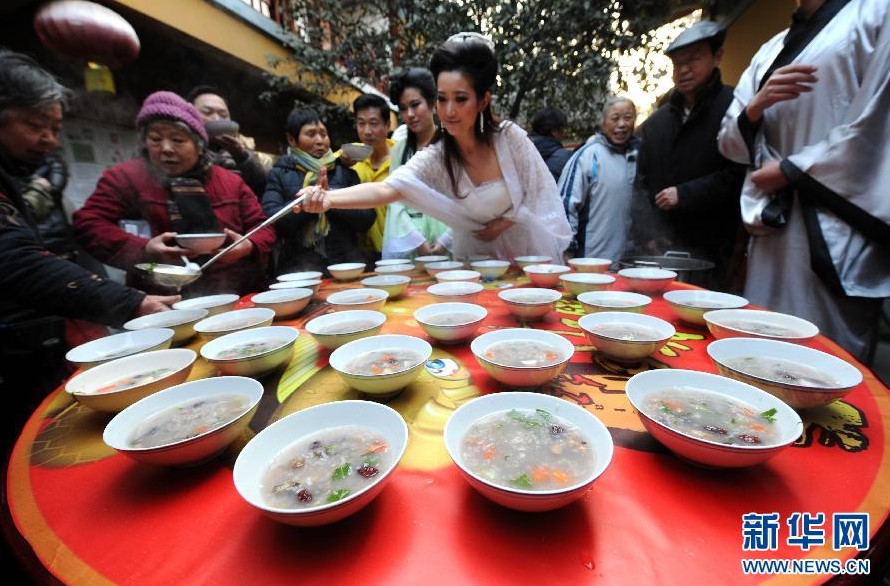 1月19日,裝扮成《白蛇傳》中“白娘子”(中)的演員在南京玄奘寺“臘八節(jié)品臘八粥”活動(dòng)上為市民盛粥。