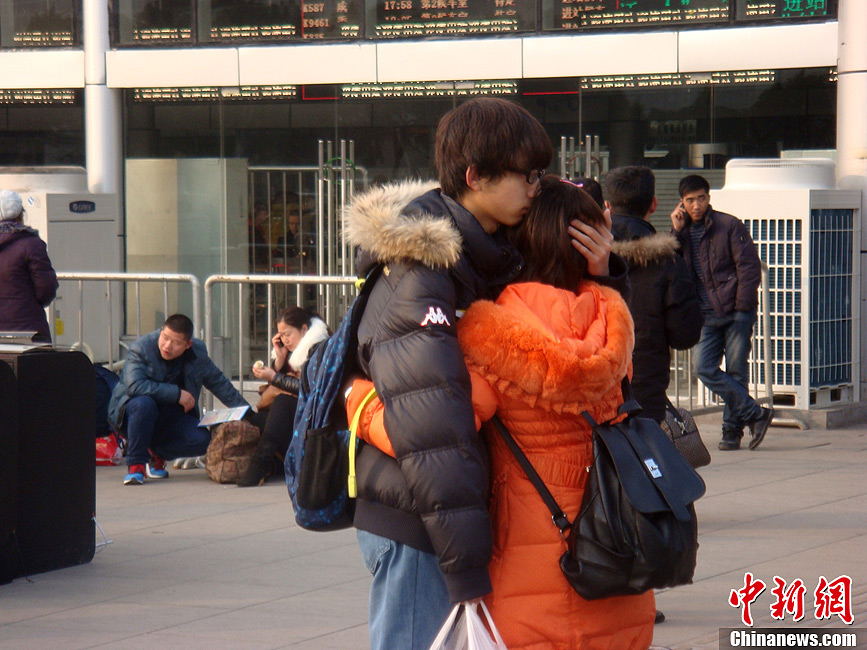 1月22日,重慶火車站迎來熙熙攘攘的人流,人們行色匆匆地踏上旅途,準(zhǔn)備回家過年。而隨著重慶高校寒假的到來,外地學(xué)子也將踏上歸途,學(xué)生情侶在車站凝望、話別、擁抱,依依惜別。圖為車站廣場上,一對學(xué)生情侶擁抱惜別。白永茂 攝