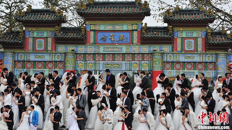 2月24日,農(nóng)歷蛇年元宵節(jié)是中國(guó)的情人節(jié),首屆珠三角青年交友婚戀文化節(jié)在肇慶七星巖景區(qū)拉開序幕,肇慶市百對(duì)身披婚紗男女與珠三角9個(gè)城市的千余未婚男女重新演繹中國(guó)經(jīng)典的婚嫁情景:“掛愿”(張燈結(jié)彩)、“投愿”(恩愿樹前投愿望球)、“系愿”(系鎖)、“行愿”(同穿一雙鞋)、“生愿”(放生行善)和“愛愿”與丹頂鶴共舞,表達(dá)情侶的忠貞不渝。圖為百對(duì)新人上演“接吻大戰(zhàn)”。中新社發(fā)黃耀輝攝