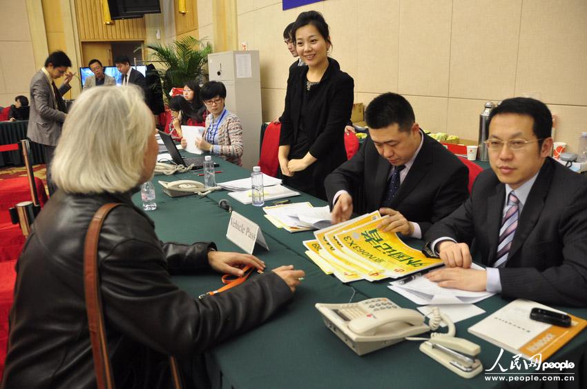 人民網(wǎng)北京3月1日電(記者趙晶)1日下午,記者來到位于梅地亞中心的2013年兩會新聞中心,工作人員在為參會記者辦理證件領(lǐng)取工作。