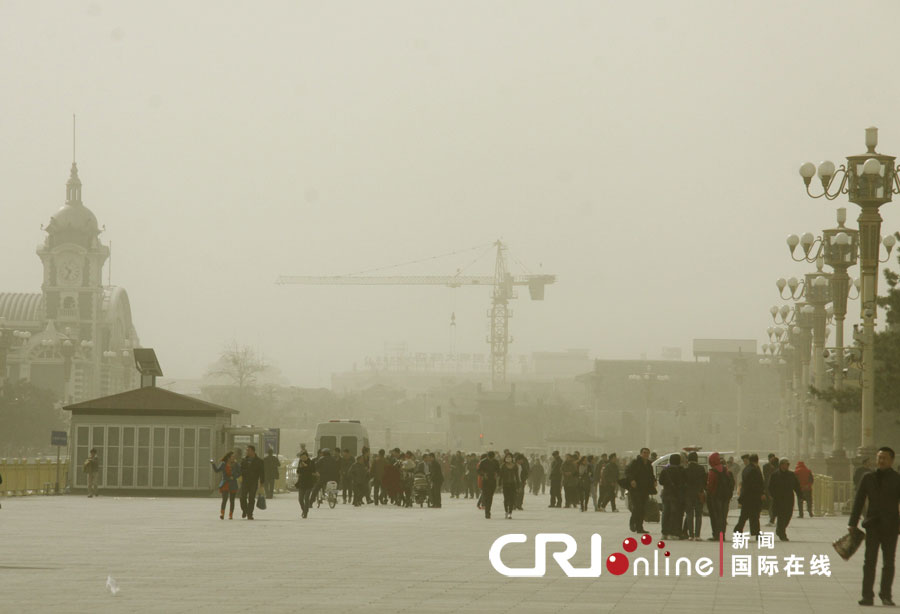 9日,北京遭遇今年第二次大風(fēng)沙塵天氣,陣風(fēng)達(dá)7、8級,并伴有大幅降溫。最近3日,京城呈現(xiàn)出“霧霾未去、沙塵再起”的天氣過程。圖為天安門廣場。馬里 攝