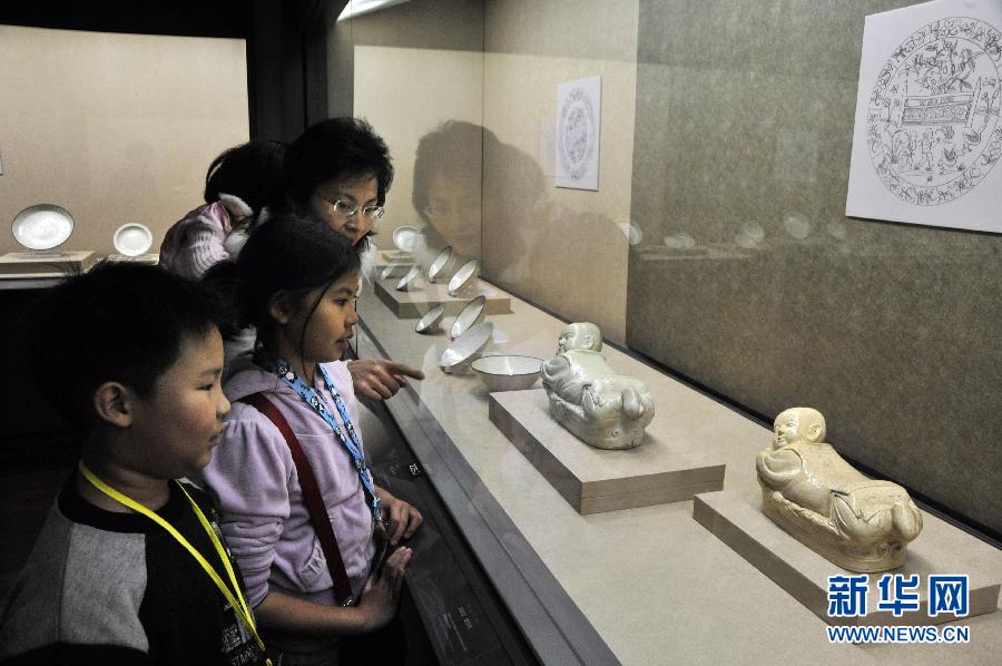1月10日,觀眾在展廳內(nèi)觀看定窯嬰兒枕。近日,臺北故宮館藏定窯瓷器特展開幕,臺北故宮從館藏定窯瓷器中精選132件作品展出。