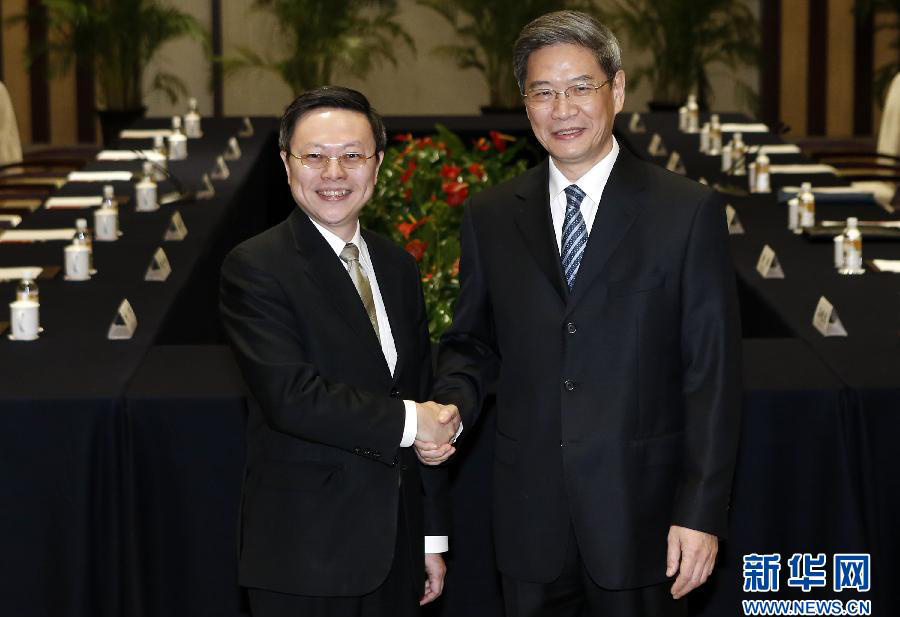 2月11日,國臺辦主任張志軍在南京與臺灣方面大陸委員會負責人王郁琦舉行雙方兩岸事務主管部門負責人首次正式會面。這是兩部門間建立常態(tài)化聯(lián)系溝通機制的開端。圖為張志軍(右)與王郁琦在舉行正式會面前握手。新華社記者 沈伯韓 攝