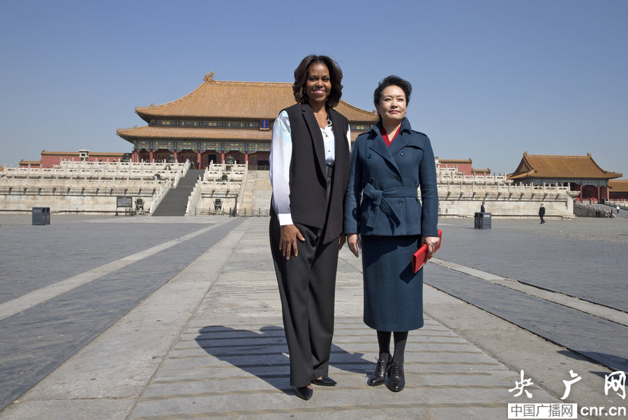 2014年3月21日,北京,彭麗媛陪同米歇爾一家在故宮參觀。圖為彭麗媛與米歇爾在故宮合影。