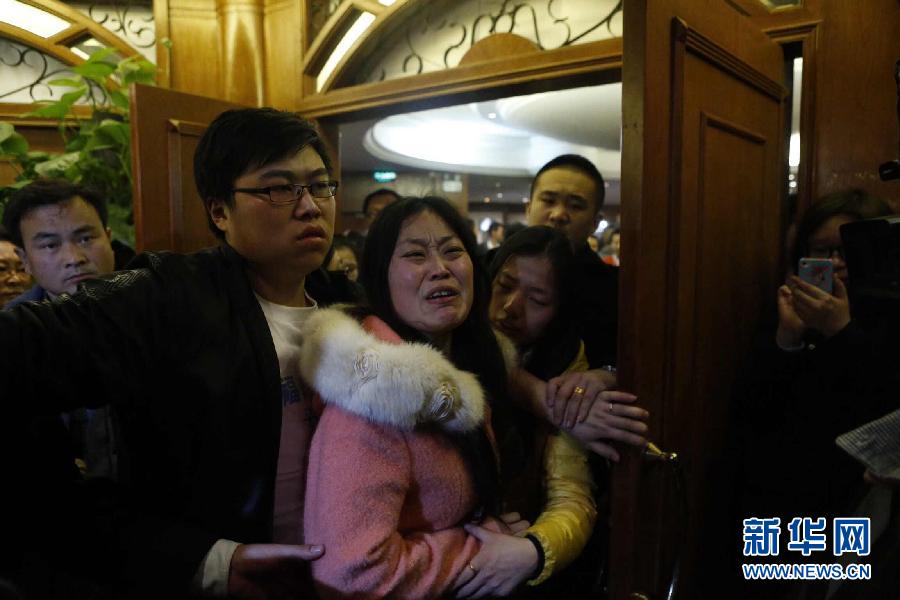 3月24日,在馬來西亞總理宣布馬航失聯(lián)客機落入南印度洋后,在北京麗都維景酒店等候的乘客家屬悲痛不已。 新華社記者沈伯韓攝