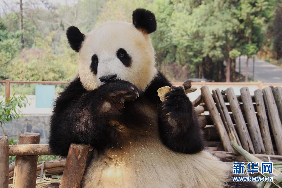 4月26日,大熊貓思嘉坐在棲架上吃窩頭。為此動物園通過讓思嘉看電視、蕩秋千等辦法,讓思嘉漸漸恢復(fù)快樂本色,體重也有所增加。云南野生動物園的大熊貓思嘉是汶川地震后,由臥龍中國保護(hù)大熊貓研究中心送到云南寄養(yǎng)的3只大熊貓之一。