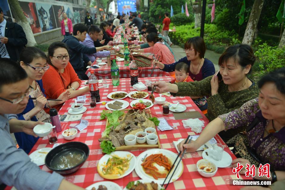 4月26日,食客們在杭州“全牛宴流水席”上就餐。當日,2014第五屆杭州拱墅運河美食節(jié)的壓軸大戲——“全牛宴流水席”在京杭大運河邊的大兜路美食街開席。本場“全牛宴流水席”設138桌,一字排開總長約450米,由100名廚師共同制作。整臺全牛宴菜品以牛的各個部位為原料,輔以綠色食材加工而成,供千余人同時開席。中新社發(fā) 李晨韻 攝