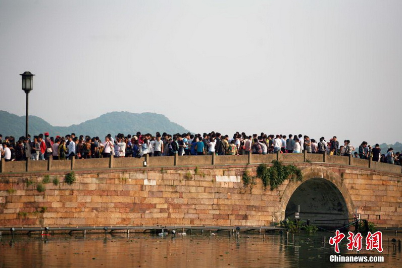 5月1日,五一小長假首日,杭州西湖景區(qū)迎來八方賓客。斷橋景點(diǎn),游人比肩接踵,只見人頭不見橋頭。