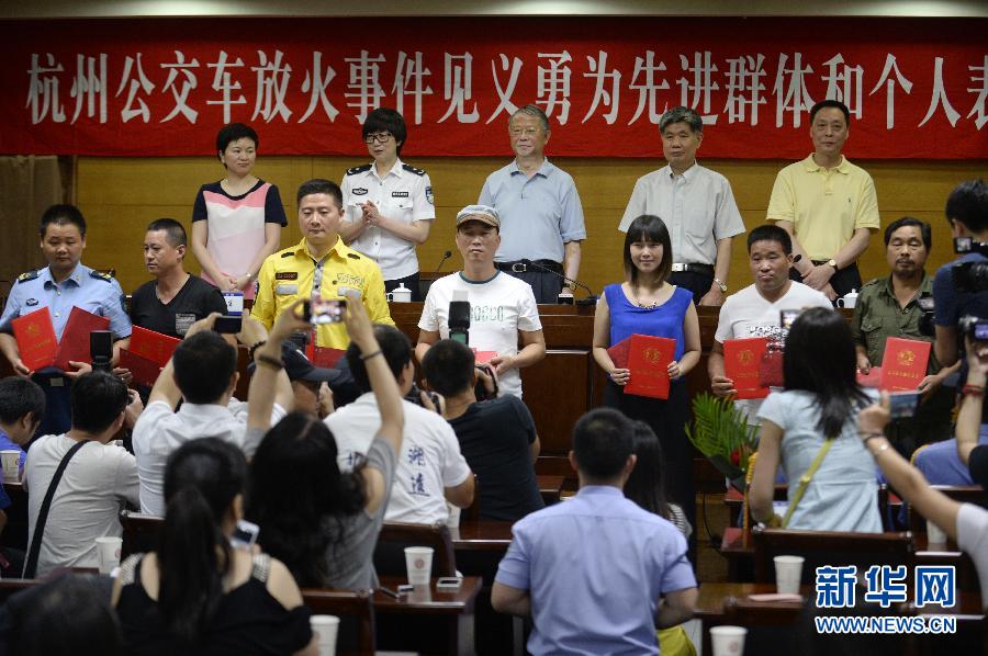 7月8日,7名杭州公交車放火事件見義勇為先進(jìn)個(gè)人在接受表彰。當(dāng)日,杭州市見義勇為基金會(huì)召開杭州公交車放火事件見義勇為先進(jìn)集體和個(gè)人表彰會(huì),授予杭州口腔醫(yī)院、西湖時(shí)代廣場(chǎng)物業(yè)服務(wù)中心和杭州市公共交通集團(tuán)有限公司等3個(gè)群體為“杭州市見義勇為先進(jìn)群體”榮譽(yù)稱號(hào),授予李鵬濤、李中義、王磊、成彪、王維、康國海和潘樟友等7人“杭州市見義勇為積極分子”榮譽(yù)稱號(hào)。5日17時(shí)許,一輛載著80多名乘客的7路公交車途徑杭州東坡路與慶春路交叉口時(shí),車內(nèi)突然起火燃燒,許多路過市民冒著危險(xiǎn),紛紛出手相助。新華社記者 鞠煥宗 攝