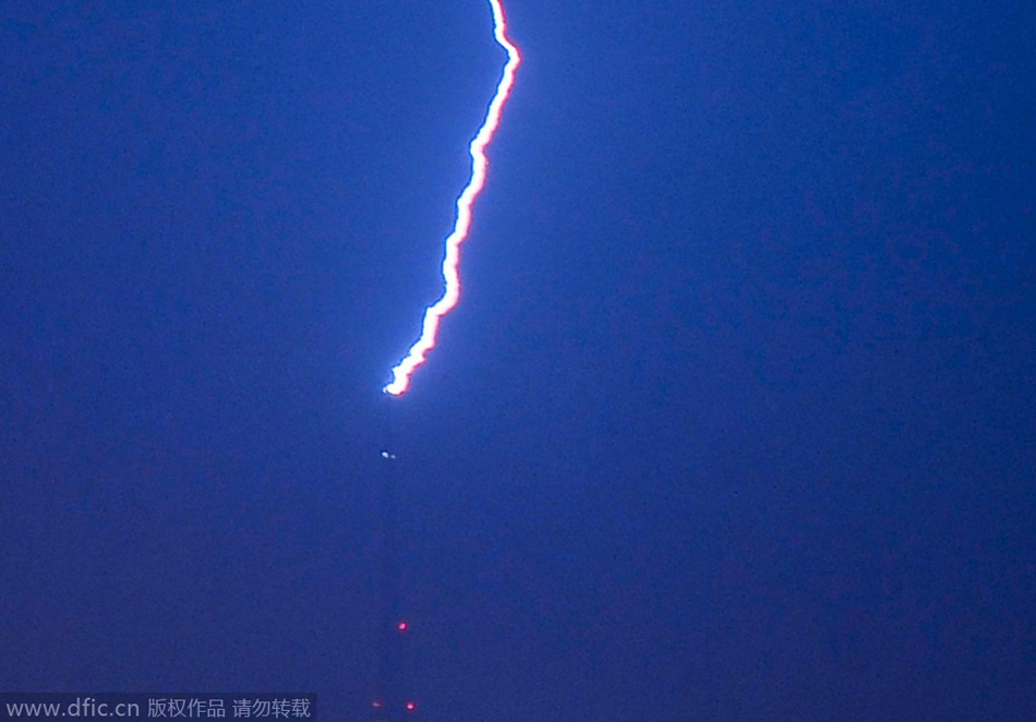 2014年8月11日午夜,雷陣雨突襲青島,一道巨型閃電擊中電視發(fā)射塔,雷聲震耳欲聾。