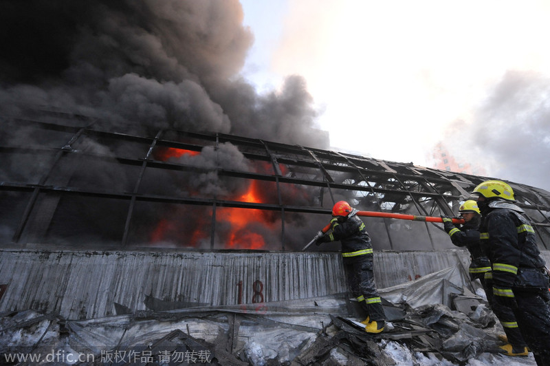 2015年1月2日13時(shí),哈爾濱道外區(qū)南勛街與南頭道街附近的一個(gè)存放廚具的庫房起火,數(shù)公里外可見濃煙。圖為哈市消防支隊(duì)現(xiàn)場(chǎng)救援。