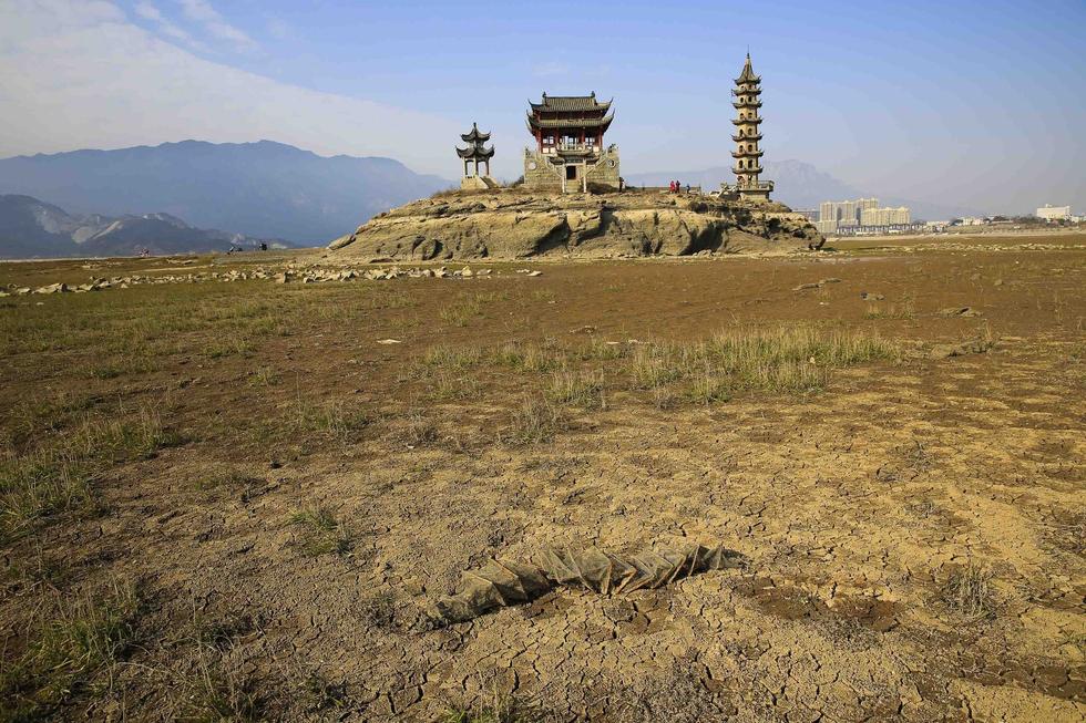 2015年1月3日,江西省九江市星子縣,受上游來(lái)水減少和久旱少雨的影響,我國(guó)第一大淡水湖鄱陽(yáng)湖逼近極枯水位,江西省星子縣標(biāo)志性景觀落星墩“水落石出”,豐水期需要渡船才能前往觀景臺(tái),現(xiàn)在步行就可以到達(dá),吸引了游人們?nèi)ビ瓮妗?/p>