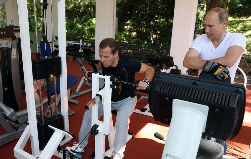 當(dāng)?shù)貢r(shí)間2015年8月30日,俄羅斯索契,俄總統(tǒng)普京與總理梅德韋杰夫在健身館內(nèi)練習(xí)器械。