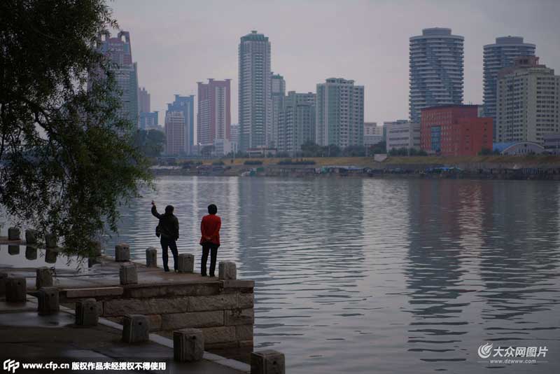 當(dāng)?shù)貢r(shí)間2015年10月10日,朝鮮平壤,兩名男子站在大同江旁。朝鮮勞動(dòng)黨迎來(lái)成立70周年紀(jì)念日。