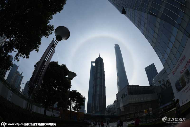 2015年10月10日,上海,一個(gè)巨大日暈現(xiàn)高樓大廈上空,至中午仍未消失,景象十分美麗壯觀。