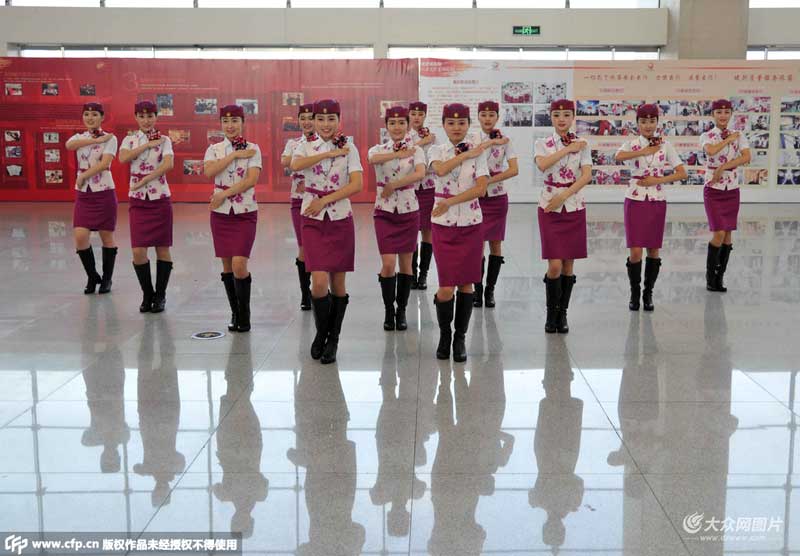 成都鐵路局動(dòng)車組乘務(wù)員在成都東站候車大廳演示服務(wù)禮儀。作者:曹寧/CFP