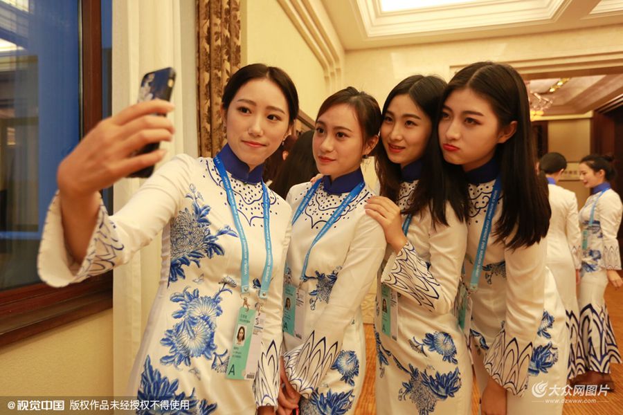 2015年12月13日,浙江嘉興,烏鎮(zhèn)枕水酒店,浙江傳媒學院的大學生禮儀換上第二屆世界互聯(lián)網(wǎng)大會的青花瓷旗袍首次亮相。