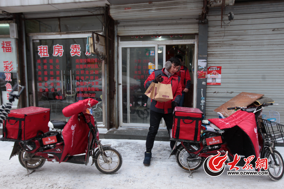 平時(shí)每天能送25—30單,但今天下雪路滑,到下午4點(diǎn)只送了13單。記者王長(zhǎng)坤 攝影