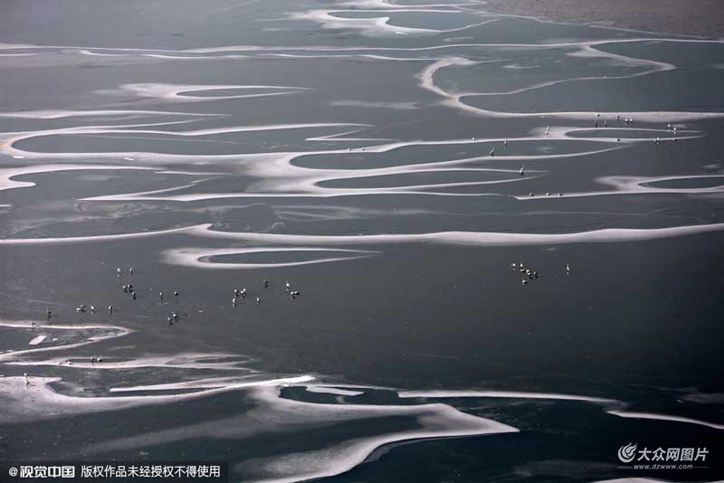 2016年1月26日,山西運(yùn)城,受極寒天氣影響,黃河山西平陸段出現(xiàn)大面積結(jié)冰。從空中俯瞰,冰層猶如蜿蜒曲折的白色絲帶浮于河面,夕陽(yáng)照射,“白色精靈”點(diǎn)綴,宛如精美的印象山水畫(huà)。