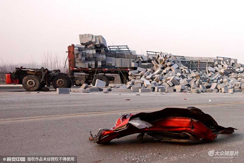 昨日7點(diǎn)左右,記者趕到中原西路西四環(huán)口西1.5公里南水北調(diào)干渠西側(cè)的事發(fā)現(xiàn)場(chǎng),只見寬闊的中原西路南半幅被小山似的大塊青磚堵塞,已經(jīng)沒了駕駛室的貨車斜停在路上。距離貨車約50米處停著一輛后八輪渣土車,右后方,貨車駕駛室扭曲成了麻花狀。