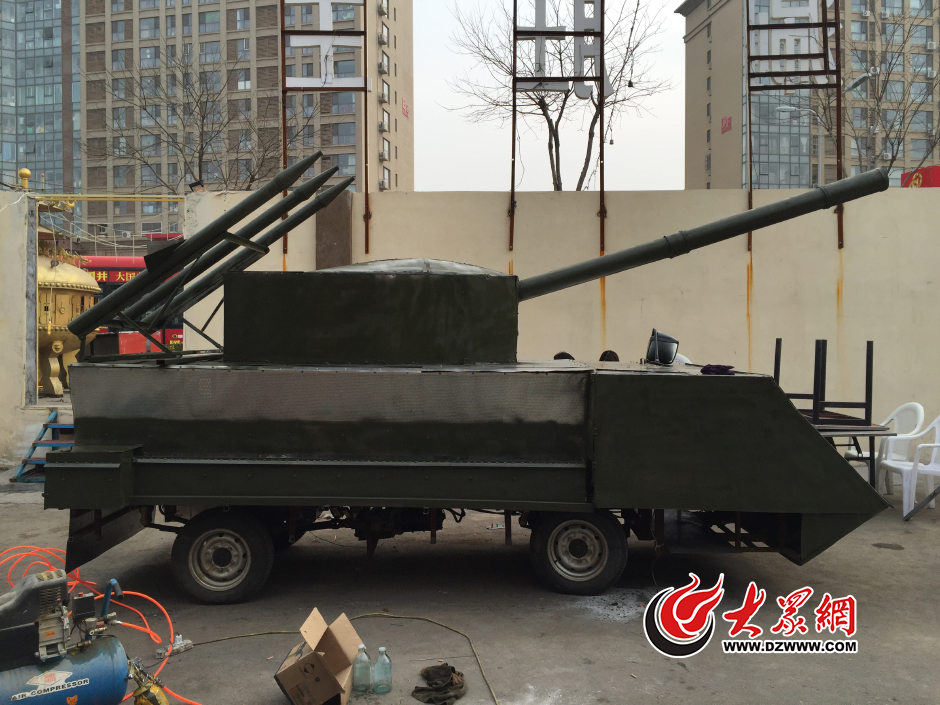 今天下午,在位于濟南明湖東路附近的一家燒烤店,“坦克燒烤車”的主人馮先生正忙著和工人一起為車輛做裝飾。馮先生告訴大眾網(wǎng)記者,他平時就喜歡動手“搗鼓”一些東西,做燒烤生意后,他發(fā)現(xiàn)傳統(tǒng)的燒烤爐子油煙太大,經(jīng)常引來食客和附近住戶的“吐槽”,于是萌生了將爐子改造的想法。大約一個月前,馮先生開始著手設(shè)計這輛“坦克燒烤車”,如今終于成型。