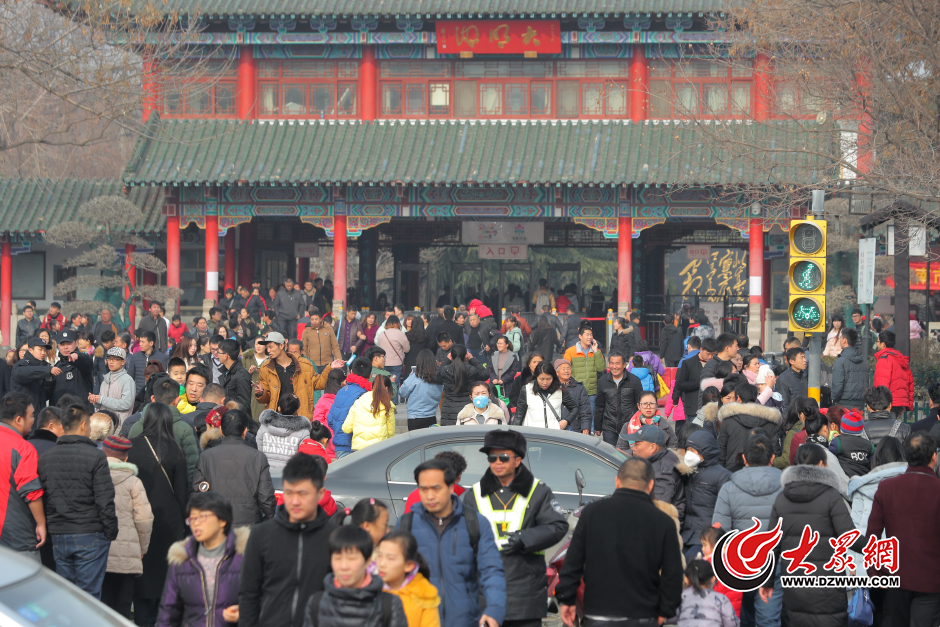 2017年1月1日,元旦假期第二天,山東濟(jì)南,大明湖風(fēng)景區(qū)游人如織、人氣爆棚。當(dāng)日,大明湖風(fēng)景名勝區(qū)收費開放區(qū)域?qū)ι鐣赓M開放,大明湖新、老區(qū)將合為一園,海內(nèi)外游客可免費游覽該景區(qū)。圖為在大明湖西南門,游客接踵而至,景區(qū)周邊交通的潮汐流現(xiàn)象十分明顯。大眾網(wǎng)記者 王長坤 攝