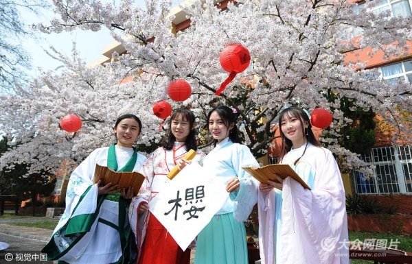 青島科大學(xué)生穿“漢服”櫻花樹下展才藝