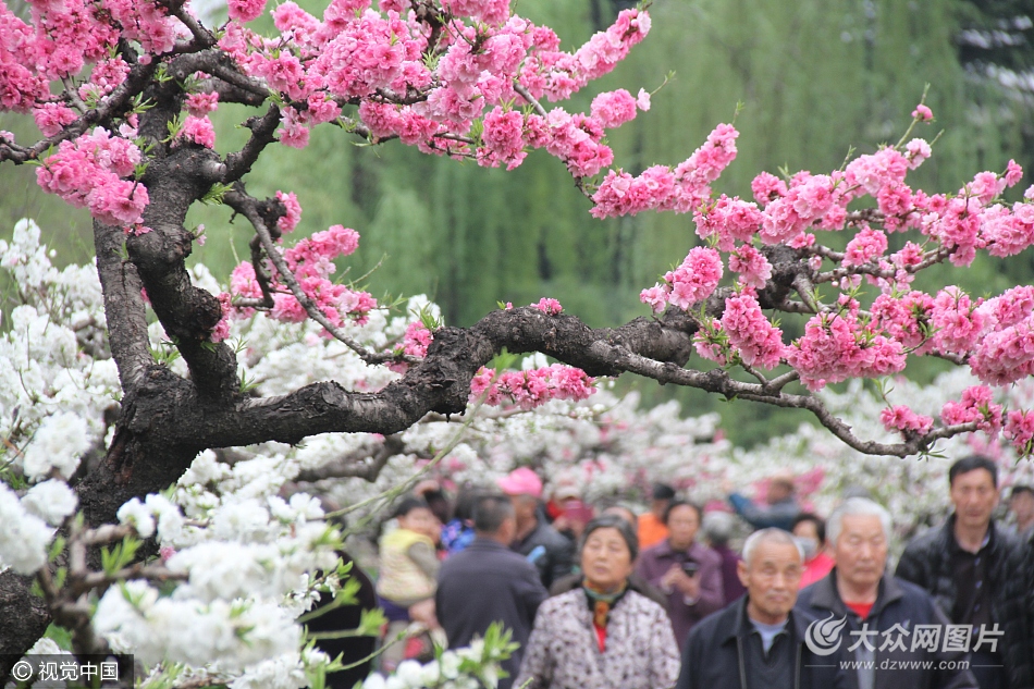 2017年4月10日,在山東濟(jì)南百花公園景區(qū)內(nèi),近百株榆葉梅競(jìng)相綻放,招引眾多市民游客前來(lái)踏青遨游花海,令人流連忘返的美景吸引不少路人拍照留念。