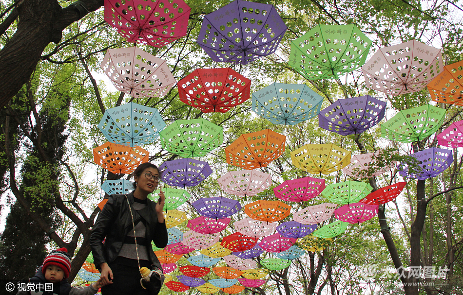 2017年4月11日,在山東濟南泉城公園景區(qū)內(nèi),近千把“七彩雨傘”懸掛在公園上空,扮靚公園,絢麗多彩的顏色自然招引眾多游客留步拍照。