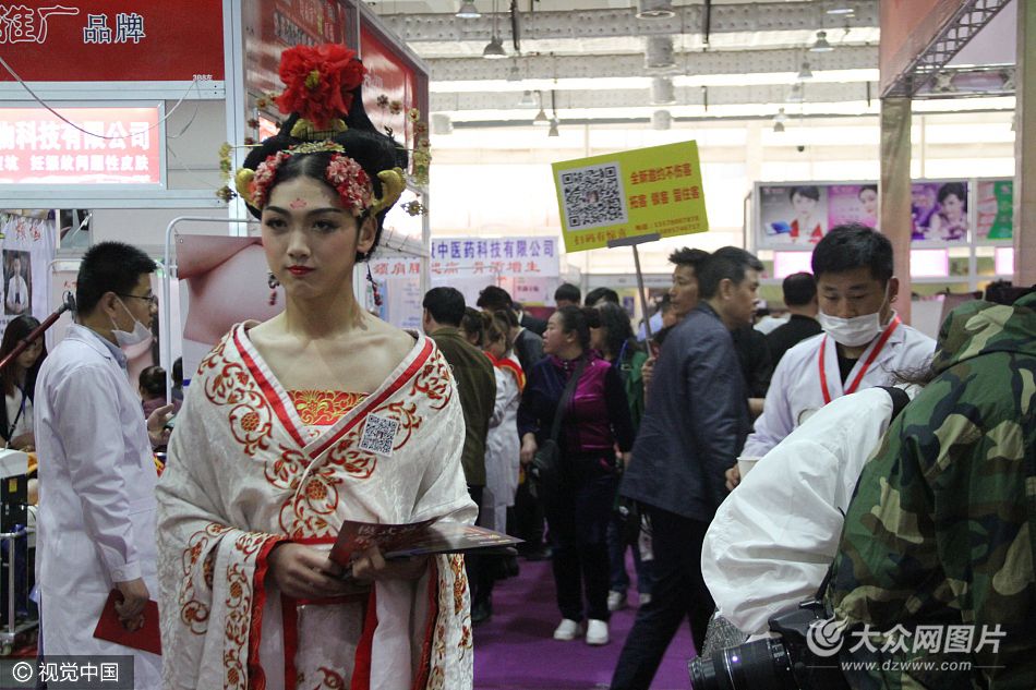 4月13日,在山東濟(jì)南國(guó)際會(huì)展中心,第33屆濟(jì)南國(guó)際美博會(huì)上,大學(xué)生“純爺們”化妝成楊貴妃形象,在展會(huì)現(xiàn)場(chǎng)發(fā)傳單攬客,吸引眾多路人的眼球。