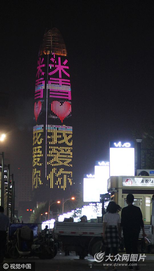 2017年4月14日,濟(jì)南最高樓點(diǎn)亮“米雪我愛你,米雪嫁給我”等巨型字幕,吸引眾多路人抬頭觀望這一爛漫的瞬間。