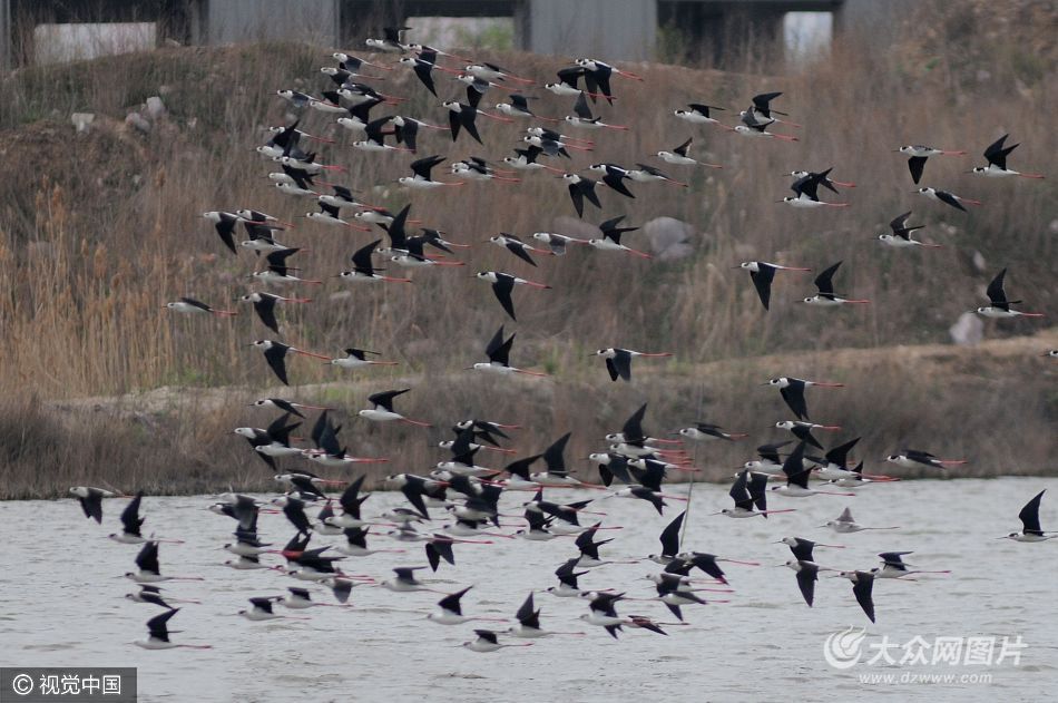 2017年4月16日,山東省青島市,進(jìn)入候鳥繁殖季節(jié),大批來(lái)自臺(tái)灣、福建沿海越冬的黑翅長(zhǎng)腳鷸、反嘴鷸、大杓鷸等鷸類候鳥開始在膠州灣濕地安家筑巢,翩躚起舞的“鷸鳥季”拉開序幕。