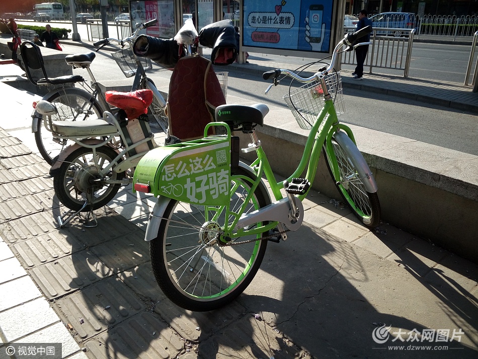 2017年4月18日,北京西城區(qū)虎坊橋路邊一輛熒綠色車身、后架上安裝著一塊黑色的太陽能板的共享單車格外引人注意,這是一款名為L(zhǎng)IVéLO的智享單車。