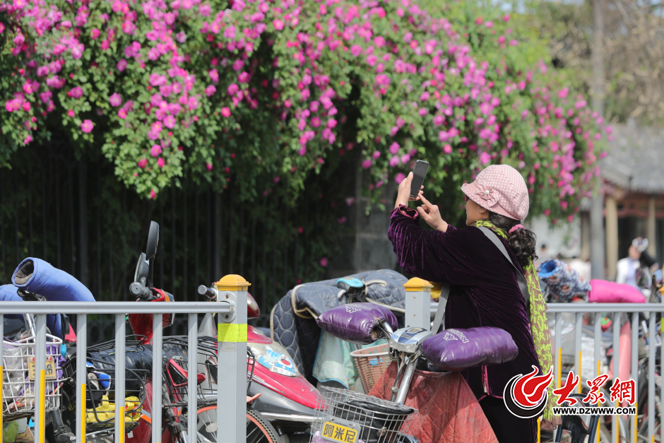 4月20日,濟(jì)南趵突泉公園外,薔薇花綴滿枝頭,搖曳多姿,吸引了眾多游客觀賞,給泉城增添了勃勃生機(jī),成一抹靚景。圖為市民在路邊拍攝薔薇花。大眾網(wǎng)記者 王長(zhǎng)坤 攝