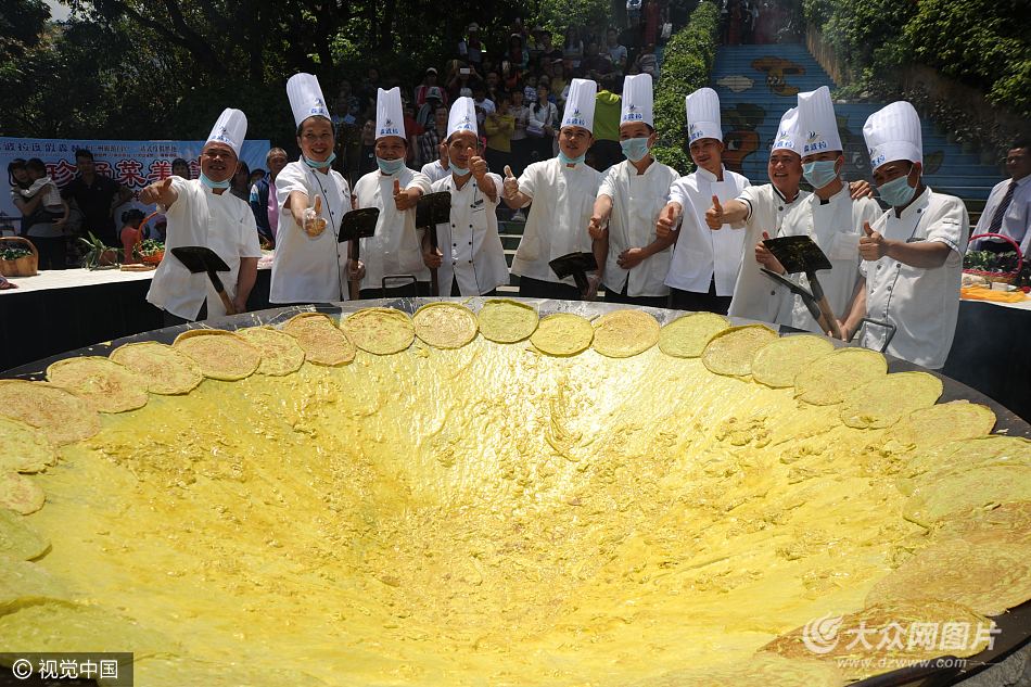 當(dāng)天上午,大廚們現(xiàn)場燒柴熱鍋,現(xiàn)場采摘新鮮藤三七葉,將1000多只新鮮有機(jī)土雞蛋、與藤三七葉榨汁攪勻,并倒入圓周直徑達(dá)3米、縱深近0.8米的巨型大鍋中,一群廚師手持1.8米的大鐵鏟,分工合作、同時煎蛋。由于巨鍋呈凹型,煎制過程非?简灩Ψ,大廚們要時刻注意火候和時間,確保鍋底不糊保證口感,還要煎成一個完整而美味的超級大蛋餅。