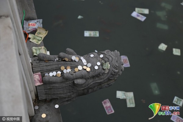2017年1月28日,河南鄭州,鄭州文廟在大年初一正常開放,不少市民前來燒香請?jiān),而文廟門前的泮池(半月形水池)內(nèi)卻被扔滿了各類紙幣、硬幣,游客還在水池邊龍首形出水口上堆滿人民幣,有人調(diào)侃“水池里的金魚都驚呆了”。
