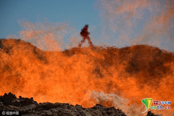 當(dāng)?shù)貢r(shí)間2017年4月28日,土庫(kù)曼斯坦東北部距烏茲別克斯坦約20公里的沙漠中,一處水坑不斷涌出白色泡沫,燃起熊熊火焰,伴著瀝青氣味,熱浪襲人。