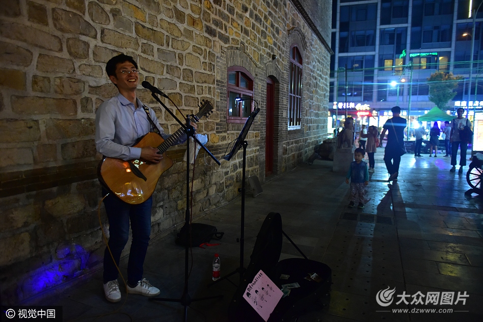 燦燦,今年28歲,山東萊蕪人。2012年大學(xué)畢業(yè)后留在了濟(jì)南,現(xiàn)在是濟(jì)南某公司的文員,晚上下班沒事的時(shí)候就到街上“賣唱”。他說,他只唱自己有體驗(yàn)、有體會(huì)的歌,在這個(gè)物欲橫流的時(shí)代,“既要朝九晚五,又要詩和遠(yuǎn)方!睜N燦現(xiàn)在是濟(jì)南一家公司的小文員,白天忙工作,晚上下班沒事的時(shí)候就到街上“唱歌”。泉城路、寬厚里是他最常去的地方,現(xiàn)在寬厚里成為他的“根據(jù)地”,只要沒事他都會(huì)到那里唱歌。唱歌主要看心情,高興了連唱三四個(gè)小時(shí)不是問題,不想唱了,就收拾東西回家。至于唱歌帶來的收入,也就百十塊錢。