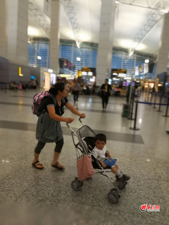 5月12日,在廣東省廣州白云機場,辣媽雙手推著寶寶車,肩上還扛著包包。(大眾網-山東24小時客戶端記者 李兆輝)