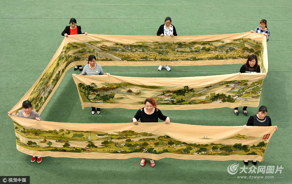 2017年5月11日,山東淄博,沂源縣東里鎮(zhèn)前繩莊村農(nóng)家婦女何鋒歷時(shí)四年,用49種不同顏色的十字繡線(xiàn),一針一線(xiàn),創(chuàng)作完成了一副長(zhǎng)22米、寬1米的巨幅《清明上河圖》十字繡作品。該幅作品中飽含684個(gè)人物、96頭牲口、122座房舍等元素,惟妙惟肖。